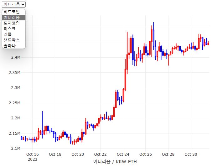 이전 예시에서는 비트코인 한가지 차트를 보여줬지만, 콤보박스를 추가해서 다른 코인도 선택가능하게 하고,