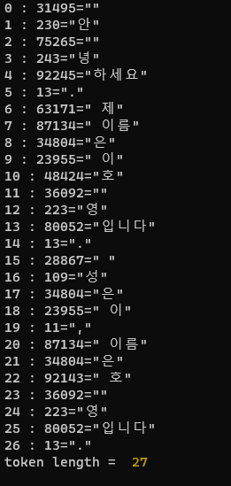 토큰 ID가 나오고 있고, 전체 문장을 디코딩하면 원래 문장으로 잘 나오고 있다.